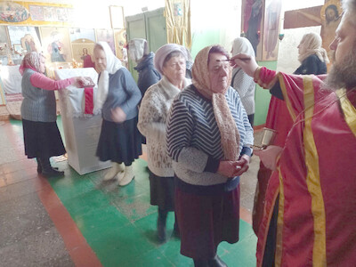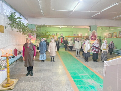 Совозсия́ днесь Све́ту Воскресе́ния свет чи́стыя ико́ны Твоея́,/ обоя́ ве́село торжеству́юще вопие́м:// сохрани́ раб Твои́х благода́тию, Влады́чице.